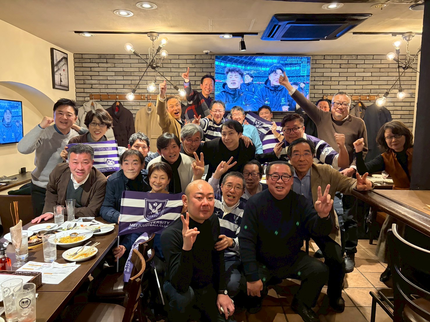【大学ラグビー決勝 明早戦】早稲田を圧倒!校友熱狂!! 2026.01.31 第62回全国大学ラグビーフットボール選手権大会 決勝は、6季ぶりの明早戦 1月11日(日)、対抗戦に続きナポリ(新潟市中央区)には、歓喜の瞬間を見ようと熱い校友23名が結集しました。 前半2トライ2ゴールを奪い、14-3とリードした明治は、後半も安定したディフェンスで22-10と圧勝。7季ぶりの大学日本一を手にしました!終始優位にたった試合展開、早稲田に勝って日本一!校友のボルテージは上がりっぱなし。明治大学校歌を大合唱し、勝利に酔いしれました。 熱狂の様子をお知らせします アルバム→